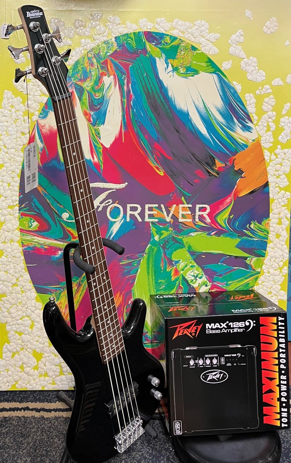 Great bass guitar pack. You get everything you need to get yourself learning the 5 string bass guitar. You get the Ibanez GSR105EX-BK 5 string bass guitar, Peavey MAX 126 amplifier, instrument cable, black strap, and a few picks. Come IN STORE to pick up.